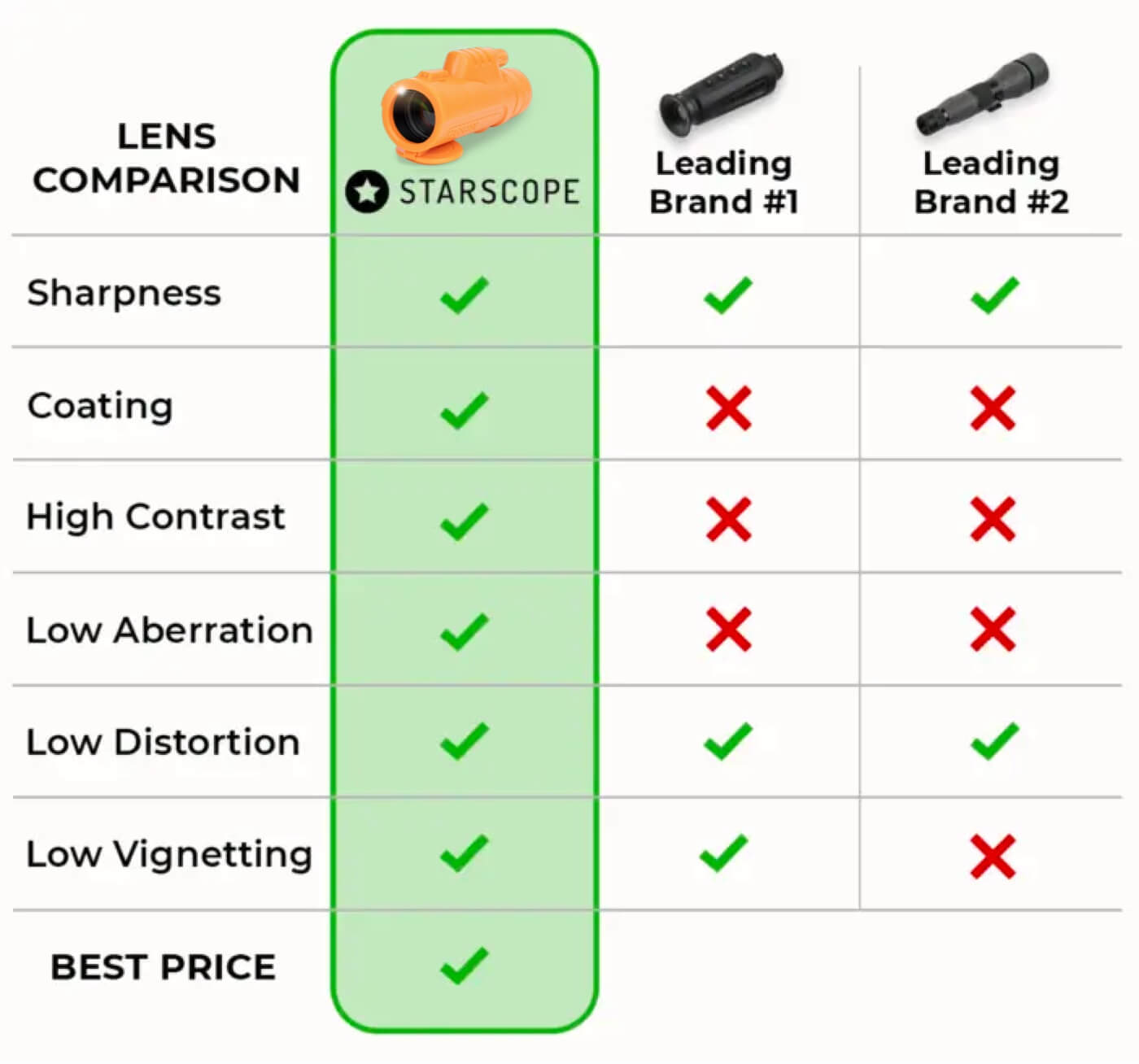 This is the main reason why Starscope has such a clear image. My $600 binoculars are like a 1080p TV. My Starscope is like a 4k TV. What I mean is Starscope has a much more clear and crisp image.